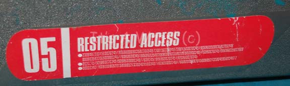 Description: A pop item like those featured in various episodes of Star Trek: The Next Generation. This item is a light-blue, semi-circular, plastic carrying case painted metallic-silver and featuring a large, red, graphical application reading “RESTRICTED ACCESS”, a snap on either side that open to multiple sites for storing tools and instruments. The item has moderate wear due to time and storage and sites where applications were removed leaving either residue from the adhesive or taking the paint with it. The item measures approx. 19 X 3 X 10 inches.