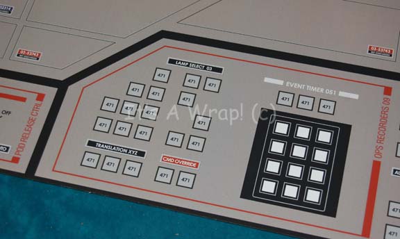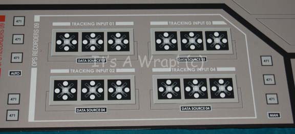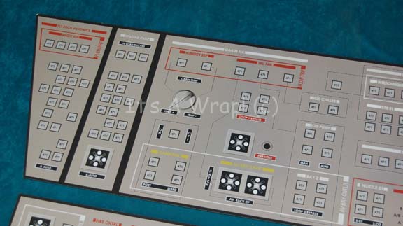 Description: A lot of four differently sized button boards created for episodes of Star Trek: Enterprise. The items are thin sheet plastic with multi-colored graphical applications adhered across the face that depict varying locations of dials, buttons, gages, switches, and their uses. The items are completely flat and do not include any of the aforementioned items, they are believed to be unused. Many of the functions the boards represent are detailed; they range from ‘Pod Release Control’, ‘Nose Wheel Steering’, FLT deck Avionics’, and Humidity Sep’, to ‘Yaw Jet Rudder’, ‘Manual’, ‘Event Timer 051’, and ‘AV Bay 3 Fan’. Two of the items measure approx. 10.5 X 16 inches, the other two measure approx. 45 X 10 inches, and 10.5 X 39.5 inches.