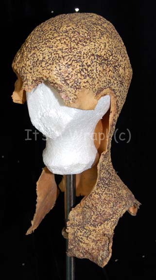 Description: A special effects make-up full head wrap intended to be an adult Suliban appearing variously in episodes of Star Trek: Enterprise. The item is molded foam rubber made to appear blotched and painted brown with a topcoat of tan. The item is in good condition overall with a supple feel generally, the edges of the item are in good condition with generally dry areas.
