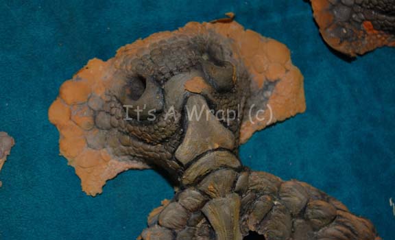 Description: A selection of painted Jem’Hadar themed facial applications like those appearing in episodes of Star Trek: Deep Space Nine. The lot consists of two brow and nose combination pieces, a forehead application, an additional head ridgeline piece, and a sheet of scales. The items depict bony protrusions and tiny horns specific to the threatening character aliens in the series. The items are in excellent condition and are believed to be screen used with supple lifelike qualities and soft edges.