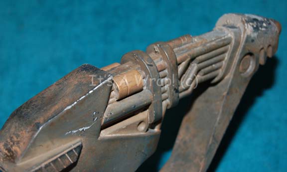 Description: A prop Jem’Hadar pistol like those appearing variously in episodes of Star Trek: Deep Space Nine. The item is made from solid cast resin painted grey with metallic gold and silver accents with a distressed wash to make the item appear ‘used’. The item is missing the notable ‘hood’ or ‘shield’ typically affixed at the emitter end of like props and remains of dried adhesive are present. Measures approx. 9 X 5 X 1.75 inches.