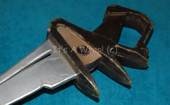 Description: A prop knife like one appearing in a display in “Worf’s” quarters (Michael Dorn) in various episodes of Star Trek: The Next Generation. The item is a molded rubber prop knife painted metallic silver with pseudo spike knuckled finger holds and a finger guard. The item measures approx. 15.25 X 5 X 1 inch. Knives of this configuration have appeared on prop energy weapons as bayonets in various episodes.