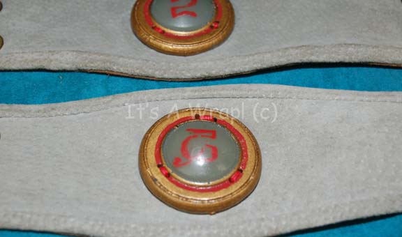 Description: A pair of blue-gray leather bracelets featured in Star Trek IV: The Voyage Home on Vulcan technicians repairing the stolen Klingon Bird of Prey that the "Enterprise" crew used to travel back in time to 1986. Sewn onto the outside of each is a molded resin badge with a ‘Vulcan’ character letter and is painted metallic gold. The bracelets snap around the wrists by way of a pair of brass colored snaps, there are two size settings and the items measure approx. 9 X 3 inches.