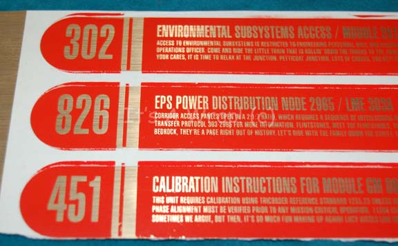 Description: A lot of three unused red themed Starfleet inventory applications on a sheet of removable white wav coated paper like those appearing variously in Star Trek episodic television and feature films. The items are metallic gold backed with red silk screening across their surface depicting multiple instructions with further information that includes realistic indications that become humorous in-jokes. The items are listed as ‘Environmental Subsystems Access /Module’, ‘EPS Power Distribution Node 2965’, and ‘Calibration Instructions For Module GM…’. The items measure approx. 7.25 X 1 inch on a sheet measuring 9 X 4 inches.