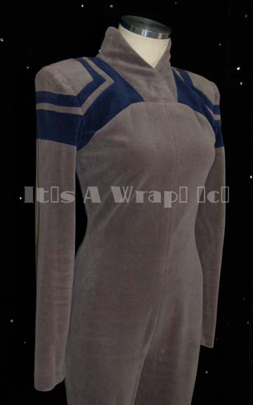 Description: A costume featured in the Star Trek: The Next Generation episode “Quality of Life”; wherein “Commander Data” (Brent Spiner) believes a machine called the “exocomp” to have gained sentience and refuses to sacrifice them for other sentient lives. This costume is that of one of the technicians aboard the station where the experiments for the “Particle Fountain” are taking place and consists of a long-sleeved, full-length, gray jumpsuit in a soft material with dark-blue stripes around the shoulders and clasps and a zip down the back. A sewn in Voyager tag denotes reuse on that series and reads ‘Chris Evans’ and a costumer’s tag reads ‘TNG #235 Quality of Life, Alien Engineers’