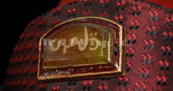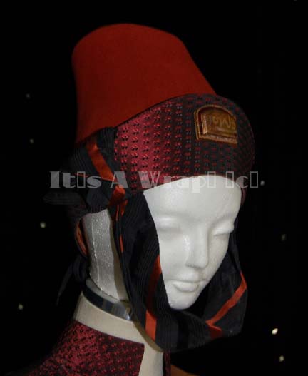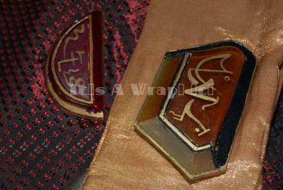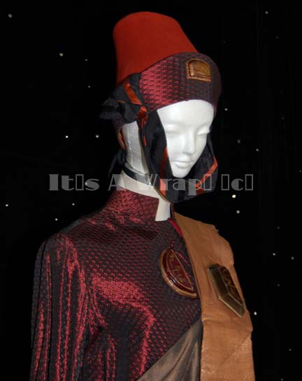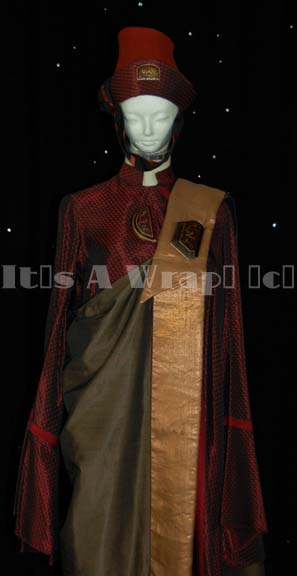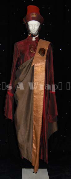 Description: A costume of the style featured in various Star Trek feature films. This costume consists of a full-length, iridescent, deep red robe featuring a design of tiny black and lighter red diamonds that add to the iridescence, large, bell sleeves with red stripes around the cuffs and a similar stripe down the front of the robe; semi-circular, faux jewel with Vulcan iconographic symbols. A large, metallic-copper, over-the-shoulder, full-length sash featuring a wide gold-colored stripe down the front with a similar faux jewel just under the shoulder. Included is a rust-colored felt, Vulcan-style hate featuring the same deep iridescent red in trim around the bottom, a black and rust-colored chinstrap, and yet another faux jewel with Vulcan iconography. Both the robe and the hat have sewn in Paramount tags that read ‘3-19’. This is the last complete example of one of these costumes expected to be found.