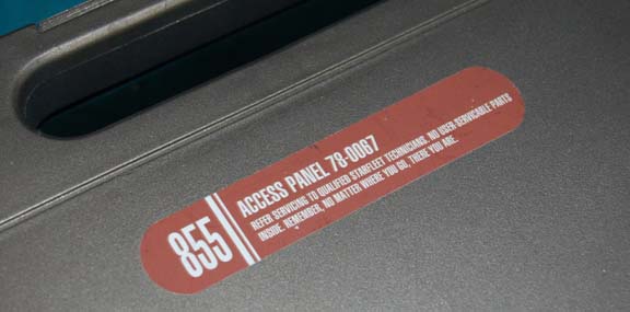 Description: A prop item of the style featured in Star Trek: The Next Generation and Voyager. This item is injection-molded plastic, in a copper/gray, vaguely diamond shape, featuring a handle with a single closure set into it, a brown, inventory, graphical application that reads ‘855 Access Panel 78-0067’ along with a warning and one of the familiar humorous comments that were often on them but too small to see. The case opens upon un-latching the snaps at the top on either side of the handle to reveal a cavity for items. The item measures approx. 3.5 X 11 X 16 inches.