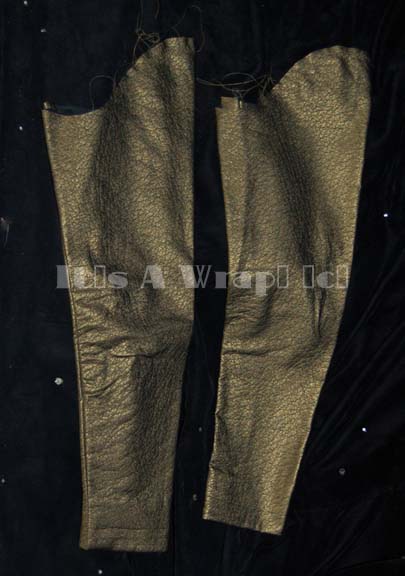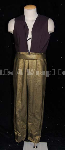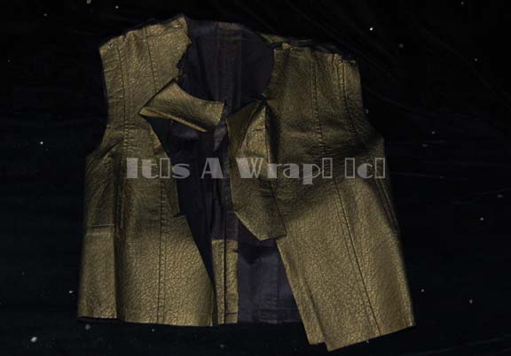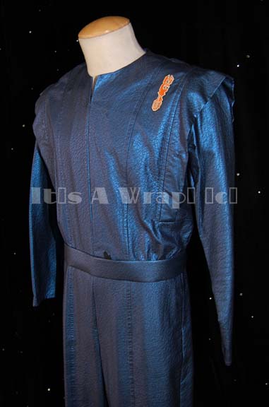 Description: A lot of costume elements featured in the Star Trek: Voyager story arc “Workforce”. This lot consists of a full-length, long-sleeved jumpsuit, in a blue reflective fabric featuring a textured, “wrinkled” design, a patch with Quarren iconographic symbols just off the left shoulder, a zip down the front, and a matching belt. Included is a sleeveless jumpsuit like the other but with a sleeveless, black, spandex-like top sewn onto reflective gold-colored trousers and an unfinished jacket that was being altered for later use to go over it. The blue jumpsuit features a sewn in tag that reads ‘Ken Gruz’, a costumer’s tag that renames this. In the two part costume, the jumpsuit denotes reuse in Enterprise by the presence of a tag but the name in the tag is smeared or faded into illegibility.
