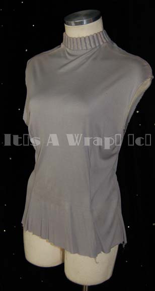 Description: A costume element like those featured in various Star Trek feature films beginning with “The Wrath of Kahn”. This item is one of the sleeveless Starfleet uniform undershirts worn by Nichelle Nichols as “Uhura”; it has a ribbed collar, clasps at the neck, and a zip down the back. The shirt is gray to denote the Operations division in the Communications/Navigation branch and has slight fraying at the hems. A sewn in Paramount tag reads ‘4 Uhura’.