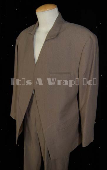 Description: A costume featured in the finale episode of Star Trek: Enterprise “These are the Voyages…”. This costume was worn by Star Trek: Enterprise associate producer Dave Rossi and includes a Mosa brand name, long-sleeved, gray, striped suit jacket and matching trousers. A sewn in Voyager tag denotes previous use and reads ‘Redondo Philip’ in addition to the Enterprise that reads ‘Dave Rossi, 098’.
