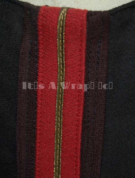 Description: A costume element like those featured in Star Trek VI: The Undiscovered Country and possibly in the opening sequences of “Generations”; a black skirt featuring wide, red stripe down the side and thin, gold piping down the middle of the stripe. The gold piping denotes flag admiral rank. A sewn in tag bears the initials ‘J.L.’.