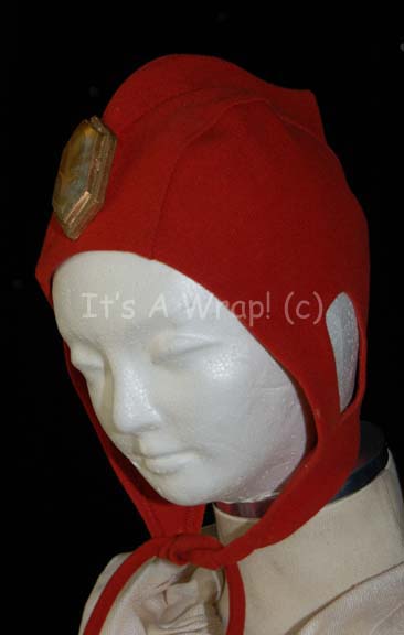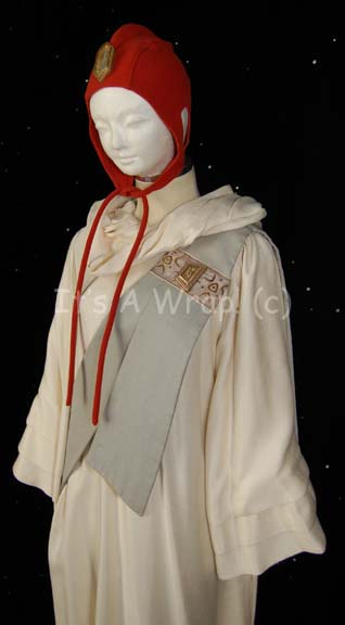 Description: A costume of the style featured in various earlier Star Trek feature films like Star Trek: The Search for Spock. This costume consists of a long-sleeved, off-white robe featuring pleated, bell-sleeves, attached hood, and a zip up the back. A blue-gray sash features a white and gold-colored inset itself with a trapezoidal faux jewel and Vulcan iconographic symbols; a rust-colored skull cap and similar ‘jewel’ on the front.