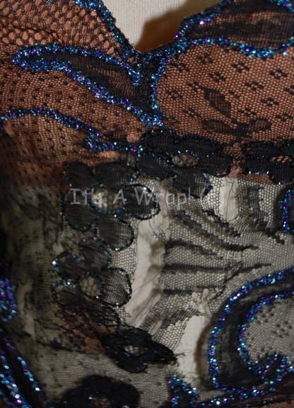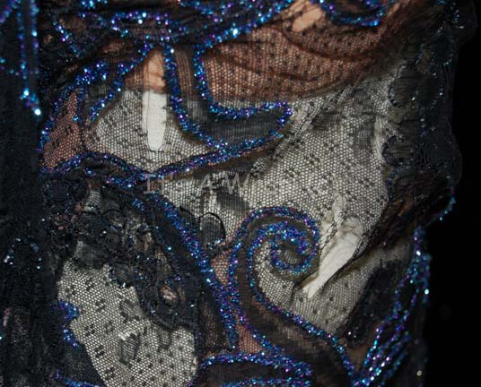 Description: A dress featured in the Star Trek: The Next Generation episode “Man of the People”; wherein “Deanna Troi” (Marina Sirtis) starts to behave jealously and inappropriately after conducting a “funeral rite” with an ambassador named “Ves Alkar” who is set to settle a fierce civil war. This dress is the one that “Deanna Troi” was wearing when she confronts one of “Alkar’s” aides in Ten Forward and “Commander Riker” (Jonathan Frakes) has to take her back to her quarters; it is a long-sleeved, full-length, sheer, black mesh dress featuring glittery purple floral pattern, zip cuff adjustment, aesthetic holes cut in the dress on the shoulders and larger ones along the hips, a sewn in bra, a zip up the back with snaps hidden by the design. The item has a few small holes due to time and storage but is it very good condition which is impressive considering its age and how fragile the dress is.