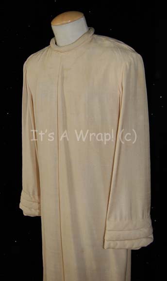 Description: A costume element like those appearing in Star Trek III: The Search for Spock. This item is long-sleeved, full length white, Vulcan robe with a zip up the spine. The sleeves are kimono style with rings sewn into the cuffs. Robes like these can be paired up to sashes for women, and drapes for men.