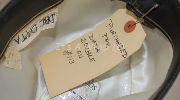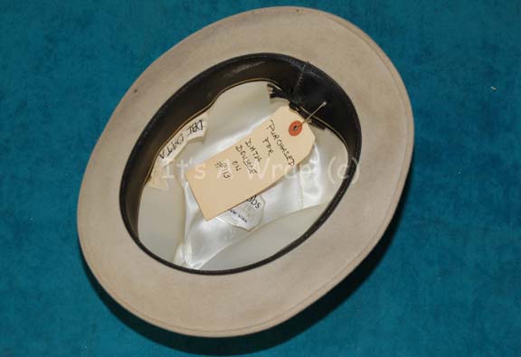 Description: A hat procured for the Star Trek: The Next Generation episode “The Big Goodbye”; wherein “Captain Picard” and several members of the crew are stuck inside the holodeck in one of the “Dixon Hill” programs. This hat is a gray fedora with black trim purchased for Brent Spiner’s double for the episode and features a tag inside that reads ‘Dbl Data’ and a costumer’s tag that reads ‘Purcahsed for Data Double on #113’.