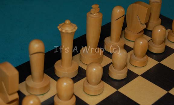 Description: A chess board lot like the one featured in the Star Trek: Enterprise episode “Observer Effect” for use by “Travis Mayweather” (Anthony Montgomery) and “Lieutenant Reed” (Dominic Keating). The lot is composed of a chess board and all corresponding white pieces made from wood, shaped to an ultra modern appearance; the black pieces are missing a single knight. The board is wood with an attractive dark frame and white wood finish and has three of four felt no scratch feet adhered to the bottom. The pieces all share this aspect, no scratch felt bases. The king pieces being the tallest measure approx. 3.75 X 1.5 inch diameter base. The board measures approx. 19 X 19 X 1 inch. A chess board like this also appeared in the episode “Horizon” in Travis’ quarters on his family’s freighter ship, the “E.C.S. Horizon”.