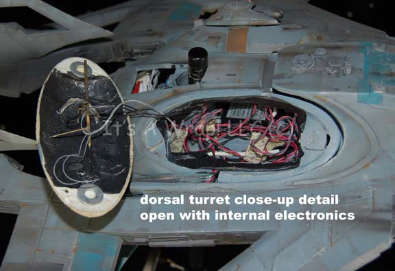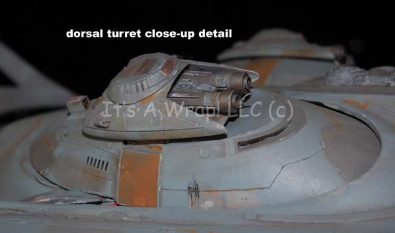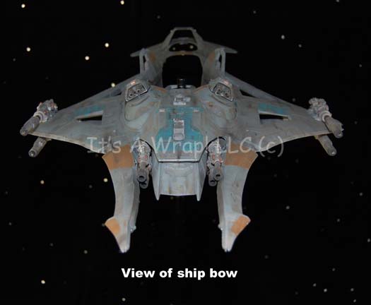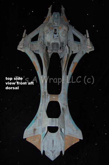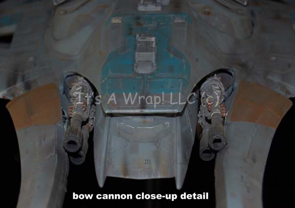 Description: A starship model created for the pilot episode television series “The Osiris Chronicles” or “Warlord: Battle for the Galaxy” as it was known in some markets. The item is the model of the “Daedalus”, an intergalactic battle cruiser commanded by a planetary warlord who, though antagonistic through much of the series pilot episode, eventually joins forces with the protagonists following the climax. The ship is over four feet long and contains intricate internal wiring for untested lights. The cannon mounts on the dorsal side are removable as are several other components, but replaced by way of magnets. A motion control rod mount is positioned at the center axis point of balance before the thruster assembly in the center fuselage, it features a removable magnetic cover. The model is painted realistically with multiple points of hand painted ‘battle damage’ like weapon hits and scoring. The item features a general coloration of light gray with raised and painted plating details. Twelve powerful-looking forward mounted cannons a positioned symmetrically around the model with multiple raised accents and metallic painted details. The model represents not only a little known sci-fi television show, but the last of an era of handmade craftsmanship. With so much of entertainment media being devoted to computer generated effects and cheaper productions, this item.