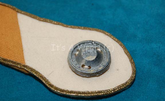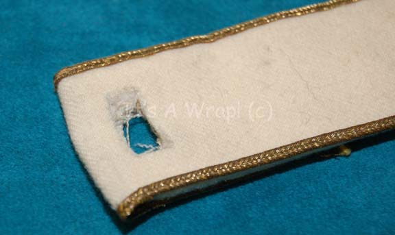 Description: A Starfleet officer’s division strip like those appearing in Star Trek feature films as early as Star Trek IV: The Voyage Home. The item command white fabric with operations gold intention flashes, gold grim, and a molded resin ‘security disk’ sewn onto the blade end that is painted metallic silver, and a punched rectangle hole at the clasp end which does not include reinforcement. The item measures approx. 11.25 inches.