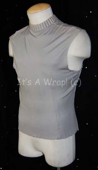 Description: A costume element similar to those featured in various Star Trek feature films beginning with “The Wrath of Kahn”. This item is a sleeveless Starfleet uniform undershirt with a ribbed collar, clasps at the neck, and a zip down the back. The shirt is gray to denote the Operations division in the Communications/Navigation branch. The hems are beginning to come unraveled and there is slight fading around the collar. The item is made for male wearers.