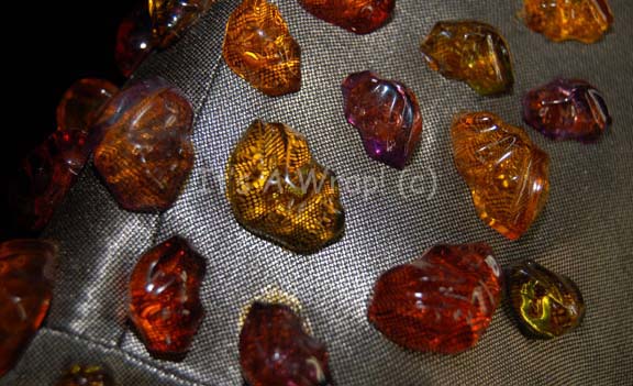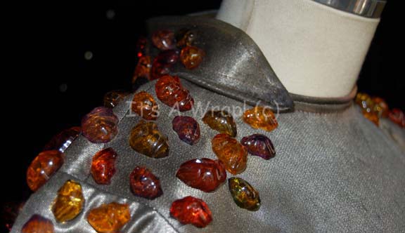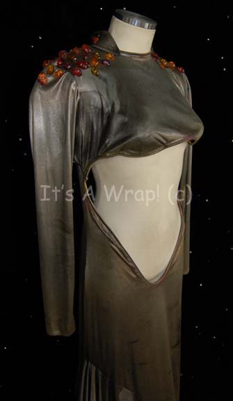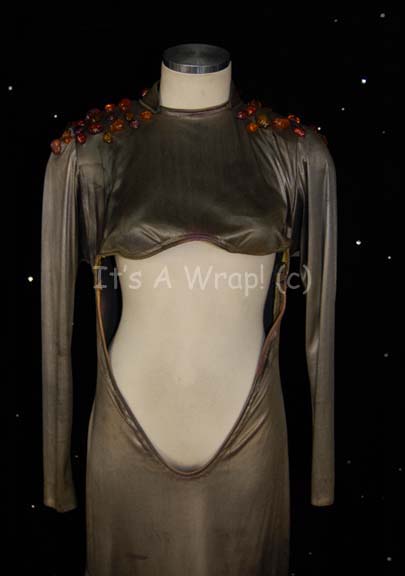 Description: A costume featured in various episodes of Star Trek: Deep Space Nine like “Emissary” or “A Man Alone”. This costume consists of a long, metallic-pewter, moderately transparent dress featuring multi-colored faux jewels across the shoulders, completely open across the abdomen on the front and back, with bra cups only covering the top half of the breast. The costume has yellow makeup residuefrom stated use in production.