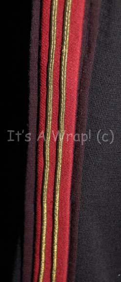 Description: A lot of costume elements like those featured in Star Trek feature films from “The Wrath of Khan” to the opening scenes “Generations”. This lot consists of a long-sleeved, Starfleet uniform undershirt in Command white with a ribbed collar and zip down the back. Included are black uniform trousers featuring a wide, red stripe down the leg with two matching gold stripes down the middle of the red one denoting admiralty. The name ‘Overman’ is written in the undershirt, a tag on the trousers reads ‘30/26’. The trousers cuffs need to be hemmed but aren’t damaged and the hem around the top of the trousers is coming loose as well.