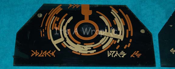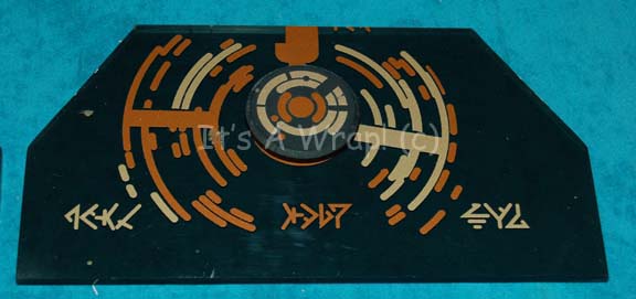 Description: A lot of two differing control surfaces believed to have been created for episodes of Star Trek: Enterprise. The items are sheets of black acrylic with metallic bronze and gold colored adhesive details and iconographic lettering. One item features a raised dial in a fixed position and scoring exists on the accompanying item for a missing, yet matching, enhancement. The items measure approx. 11 X 6 X 0.75 inches.