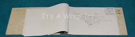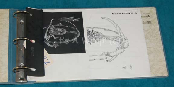 Description: A lot of digital computer renderings and duplicate sketch drawings of “Deep Space Nine”, some of which were developed by Rick Sternbach, on ten sheets of three hole punched white 8.5 X 11 inch paper and twenty-nine 11 X 17 sheets of white paper, also three hole punched. The digital renderings include images of starships docked or in flight and other pages of this size are listed as ‘Miniature Design Notes’. The sketch duplicates are signed by Rick Sternbach and include an Asian cartouche dated ‘’92’. One of the station images includes labels detailing the points of interest on the station as it would be constructed, some of the drawings indicate the measurements if they were life sized, but mainly the sketches are made to depict the materials needed to elicit a realistic approach in miniature form. The papers are carefully presented in their original 19.25 X 11.75 X three inch three ring binder.