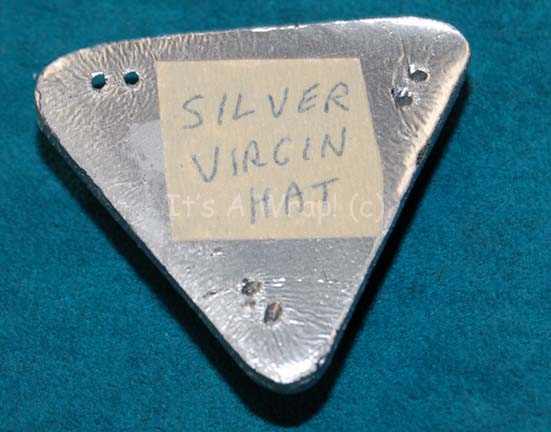 Description: A Vulcan jewelry item like those appearing in Star Trek III: The Search for Spock and Star Trek VI: The Undiscovered Country. The item is a molded paste badge fashioned to be triangular with a metallic silver painted border and a translucent iridescent raised aspect that features a painted on Vulcan iconographic letter. The item features a set of holes for sewing onto a costume and a chip out of the top. The reverse features an adhered label that reads ‘silver virgin hat’. The item measures approx. 2.25 X 2.25 X 2.25 X 0.5 inches.