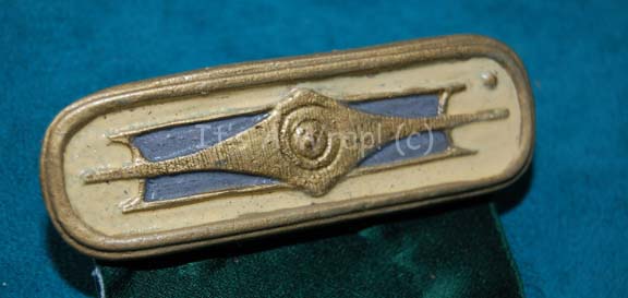 Description: A wire backed cast resin Starfleet Academy ribbon badge featured in the Star Trek: Starfleet Academy personal computer game released in 1997. The item is nearly identical to the resin bars featured as backing for Starfleet emblem badges worn by officers in Star Trek feature films painted gold, off-white, and gray, it features an adhered wire backing and green colored ribbon fabric.