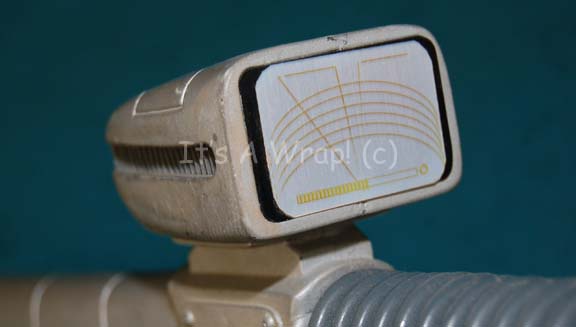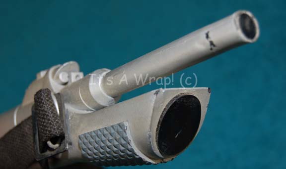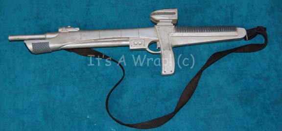 Description: A prop item featured in the Star Trek: Enterprise episode “Shadows of P’Jem; wherein “Captain Archer” (Scott Bakula) and “T’Pol” (Jolene Blalock) are taken prisoner on a planet in the Coridan system. This item is a prop weapon used by the Vulcans in their attempt to assist with the rescue effort; it is rubber cast, metallic-silver, resembling a rifle version of the pistol weapons used by the Tandarans in the episode “Detained.” It includes coiled, textured, dark-gray detail along the top of the stock, a black, nylon strap, and an attached “scope” with mild damage; there is cracked paint and minor wear to the item due to time and storage. The item measures approx. 29 X 3 X 8 inches.