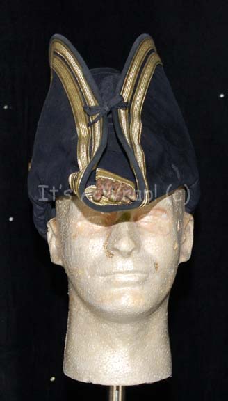 Description: A stunt costume hat created for “Worf” in Star Trek VII: Generations. The item is a Victorian era styled British Royal Navy officer’s hat used during the promotion ceremony that took place in the holodeck. The hat is navy blue with gold trim and braided tassels. The item is fitted for a large Klingon –sized head.