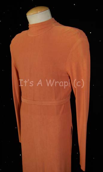 Description: A costume featured in various episodes of Star Trek: Deep Space Nine. This is the costume worn by the Female Founder, it consists of a sleeveless, orange leotard, a long-sleeved, full-length, matching over-robe, attached waist tie, and has mild fading along the shoulders. A sewn in Deep Space Nine tag in each item reads ‘Salome Jens’ and a costumer’s tag reads ‘Shapeshifter, Salome Jens’.