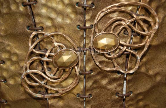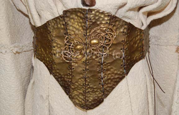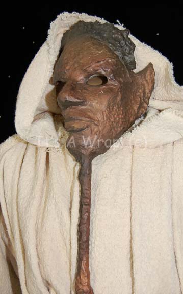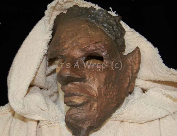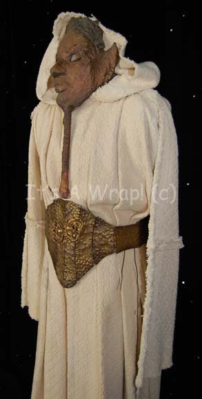 Description: A costume featured in the Star Trek: Voyager episode “Muse” and for wear by Michael Houston King in the role of “Jero”, the man who played ‘Tuvok’ in the ‘Voyager Eternals’ plays created by “Kellis” (Joseph Will) through hearing log entries of the crashed Delta Flyer. This costume consists of a long-sleeved, full-length white robe featuring a textured design, intentionally frayed hems for the aesthetic appeal, Velcro placement down the back, and a clasp at the top; a "corset" of leather strips made to look like pounded bronze, tied together with leather string and featuring yellow faux jewels on coiled, gold-colored metal accents. A sewn in Voyager tag reads ‘Michael Houston King’ and a label on the “corset” denotes it for wear by “Jero”. Included is the associated ‘mask’ that this member of the play wore for his character; this mask is an exaggerated visage of “Commander Tuvok” (Tim Russ), it consists of strips of fabric on the reverse, coated with a resin finish and made to look like hand beaten bronze. The mask covers approx. ¾ of the face leaving only the left side of the face from the cheek down uncovered. Attached to the bottom of the chin is a resin-cast handle for the actor to hold about the size of the forearm. The item measures approx. 23 X 9.5 inches.