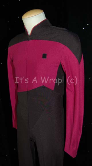 Description: A costume featured in various episodes of Star Trek: The Next Generation and earlier episodes of Star Trek: Deep Space Nine. This costume is a Starfleet uniform jumpsuit featuring black shoulders, a Command Red chest, back, sleeves, and piping around the Mandarin collar; a black waist and legs that end in stirrups. This particular uniform has a zip down the back and features a Velcro patch on the left breast for a commbadge (sold separately). A sewn in Deep Space Nine tag reads ‘Clyde Philson’, second tag beneath reads ’38, 107’ denotes wear by ‘Curt Truman’, and a costumer's tag restates this.