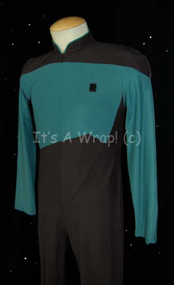 Description: A costume featured in various episodes of Star Trek: The Next Generation. This costume was worn by Michael Braveheart as the recurring character “Crewman Martinez”, and is a TNG-style Starfleet uniform jumpsuit featuring black shoulders, a Sciences Blue chest, back, sleeves, and piping around the Mandarin collar; a black waist and legs that end in stirrups. This particular uniform has zips that close the front of the costume and features a Velcro patch on the left breast for a commbadge (sold separately). A sewn in tag reads ’42, 276’.