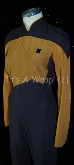 Description: A costume featured in various episodes of Star Trek: The Next Generation. This costume is a Starfleet uniform jumpsuit and features black shoulders with an Operations Gold chest, back, sleeves, and as piping around the Mandarin collar; black waist and legs that end in stirrups, a zip down the front, Velcro placement for a commbadge on the left breast (sold separately).The costume was worn by Lena Banks who was a regular extra in the last two seasons of TNG. A sewn in Star Trek: TNG tag reads ‘Lena Banks’.