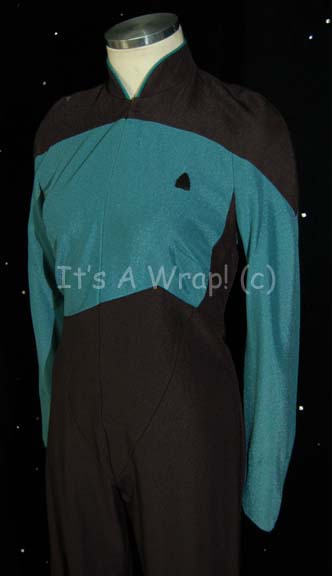 Description: A costume featured in various episodes of Star Trek: The Next Generation. This costume is a TNG-style Starfleet uniform jumpsuit featuring black shoulders, a Sciences Blue chest, back, sleeves, and piping around the Mandarin collar; a black waist and legs that end in stirrups. This particular uniform has zips that close the front of the costume and features a Velcro patch on the left breast for a commbadge (sold separately). A sewn in tag reads ’34, 035’.