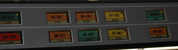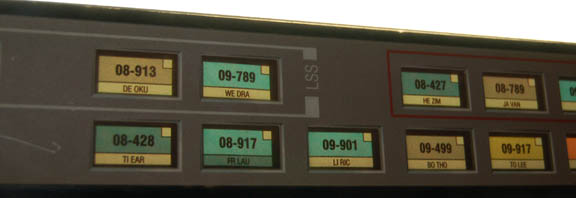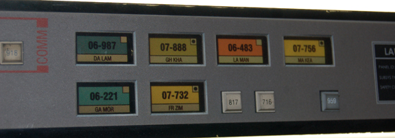 Description: A long indicator panel inset featured in the Star Trek: Enterprise episode “Future Tense” as part of the “Enterprise NX-01” launch bay set. The item is a sheet of smoked acrylic with multi-colored graphical applications adhered to both the face and reverse, and four rubber faux buttons adhered to the face. The item depicts various multi-colored indicator lights that are best viewed when back lit by an external light source. The right side face reads ‘Launch Support’ and several of the indicators feature lettered acronyms that reference Star Trek production personnel inscribed as ‘DE OKU’, ‘HE ZIM’, and many more. The item shared screen time with “Malcolm Reed” (Dominic Keating) and “Captain Archer” (Scott Bakula) and measures approx. 3.25 X 48.75 inches with rounded corners.