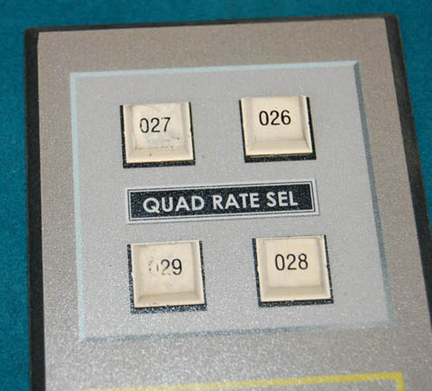 Description: A button panel like those appearing variously in episodes of Star Trek: Enterprise. The item is a piece of sheet plastic with beveled edges and a series of gray, white, and black colored rubber faux buttons adorning the face with a multi-colored graphical application. The item is labeled ‘Quad Rate Sel’ and ‘B3-A’. Measures approx. 3 X 9 X 0.25 inches and retains double sides adhesive from set production use on the reverse.
