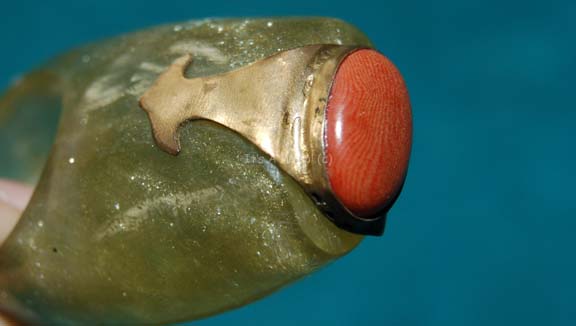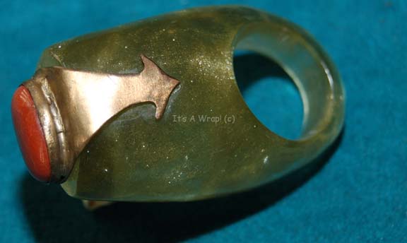 Description: An oversized costume jewelry ring created for use in Star Trek feature films or episodic television. The item is made from molded translucent resin fashioned to stand out and features a shaped metal embellishment on the end with a rust brown colored stone inset. The item measures approx. 1.25 X 1 X 2.5 inches.