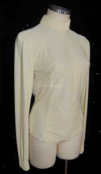 Description: A costume item featured in the third Star Trek feature film “The Search for Spock”. This item is a long-sleeved, Starfleet uniform undershirt in Command White, featuring collar ribbing, a zip up the back with clasps at the neck and a sewn in Paramount tag that reads ‘3’.
