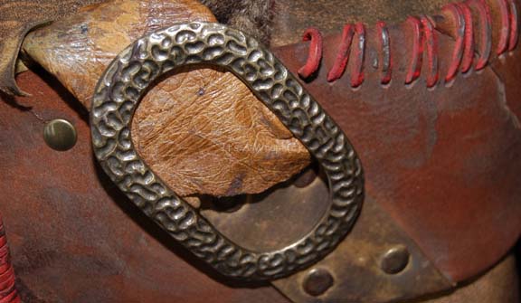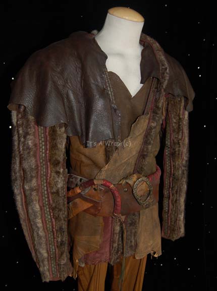 Description: A costume featured in the Star Trek: Enterprise episode “Judgment” and believed to have been later reused in various episodes. This costume consists of a long-sleeved jacket featuring different textures of leather and vinyl, faux fur down the front and back and along the sleeves with further braided leather accents; all in shades of dark brown and black, stitched together in a piecemeal fashion and distressed to appear “dirty” or “used”. Included is bandolier/belt in similar materials and colors with coiled and studded further leather accents stitched together with still more leather cord, and light-brown, overall-style trousers with multiple sites of pleating down the front and sides of the legs. A sewn in Enterprise tag in the jacket reads ‘Juan Mabson 045’, a tag in the trousers reads ‘Joe Billington 045’ and a label on the belt reads ‘Michael Bailous’.