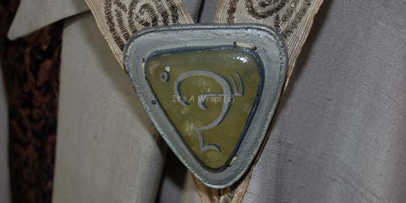 Description: A costume like those featured in various Star Trek feature films and episodic television. This costume consists of a long-sleeved, full-length, blue-gray robe with a raised collar and loose, pleated, sleeves; a full-length, black, over-the-shoulder sash featuring an intricate, embroidered, silver, pink, and royal-blue colored floral design, a wide blue-gray stripe over the shoulder with a yellow faux jewel inscribed with Vulcan iconography. Included is a white, felt, Vulcan-style hat featuring textured, metallic-silver trim, and further gray trim forming a chinstrap, an attached drape that sets upon the chest with gold-colored stripes in spiral and interlocking patterns. On the front of the hat and at the bottom of the attached drape are triangular, off-white, faux jewels with Vulcan iconographic symbols. A sewn in Paramount tag on the sash reads ‘1-12’ and one in the hat reads ‘5-2’. This costume is one of a vew few if not the last of its kind.