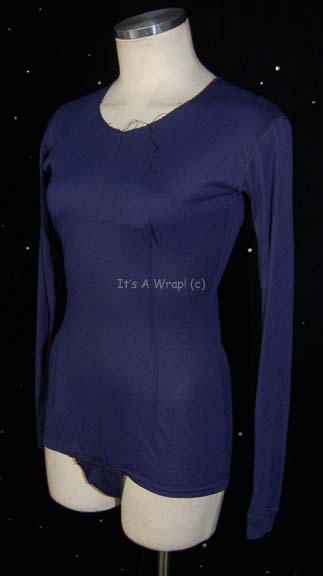 Description: A costume element like those featured in various episodes of Star Trek: Voyager. This item is a short-sleeved, form-fitting, dark-blue shirt. The item exhibits evidence of a tag having been removed and was located in the Jeri Ryan section with identical items.