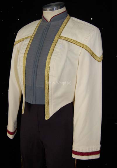 Description: A costume of the style first appearing in Star Trek IX: Insurrection, later Star Trek: Deep Space Nine, and finally during the wedding scenes in Star Trek X: Nemesis. This costume is the new style Starfleet dress uniform consisting of a full-length, sleeveless, black jumpsuit with black and gold-colored braiding trimming further, wide, gold-colored stripes down the leg with a Command red division strip in the middle. A cropped, long-sleeved, white uniform jacket featuring a gray, quilted center with a zip front bordered by similar gold trim down the lapel and around the quilted white shoulders. Command Red piping around the collar, a division strip with the same black and gold-colored braid as on the trousers, and a special white Velcro placement for a Starfleet commbadge (sold separately). A sewn in tag denoting use in Star Trek: Nemesis reads ‘Ivy Borg, 11-01’.
