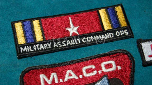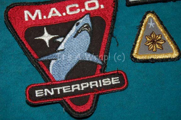 Description: A lot of patches located together to create the costume embellishments for the character “Major Hayes” as portrayed by Steven Culp in episodes of Star Trek: Enterprise like “The Shipment” and “Countdown”. The items are a triangular MACO assignment patch with a great white shark graphic and a white star reading out ‘Enterprise’, a multi-colored MACO division strip reading ‘Military Assault Command Ops’, a name strip reading ‘J. Hayes, and a rank patch with a glittering gold colored oak leaf indicating the rank of ‘major’. The name badge and rank appear to have been used but are in excellent condition.