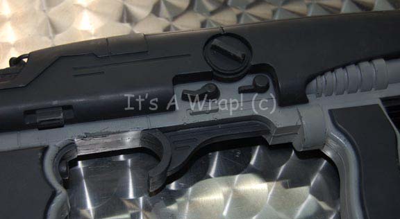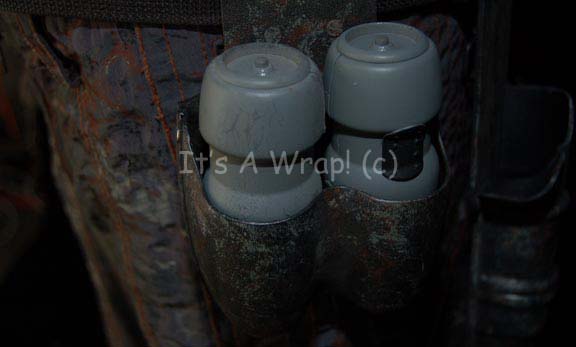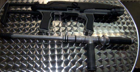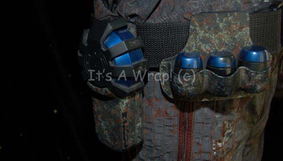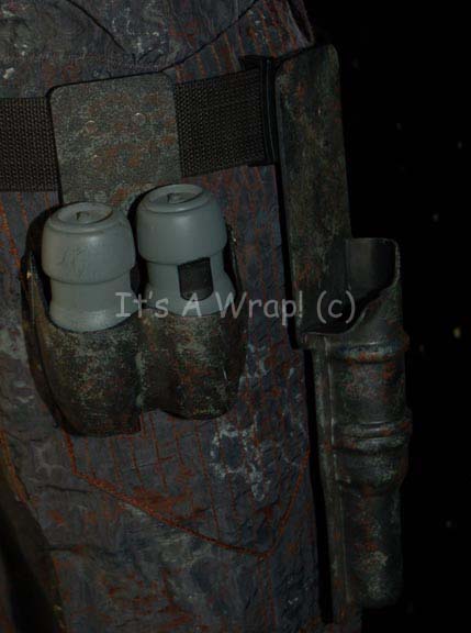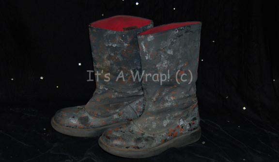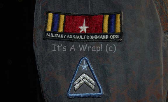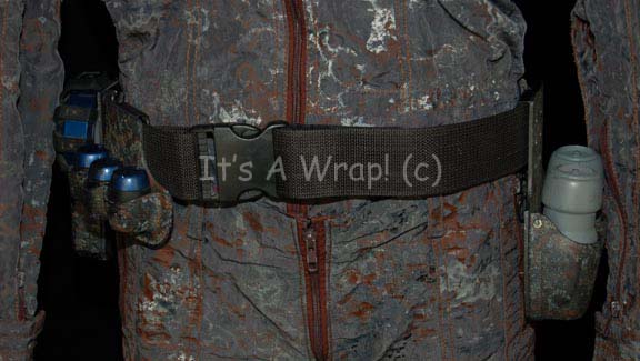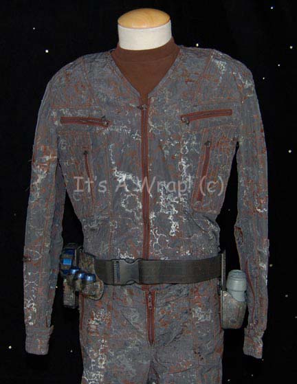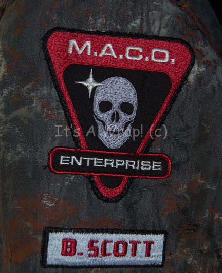 Description: A costume featured in the second episode of the ‘mirror universe’ story arc of Star Trek: Enterprise, “In a Mirror, Darkly: Part II”. This costume is a MACO (Military Assault Command Operations) costume configured to represent soldiers in the Terran Empire, it consists of a jacket, trousers, and boots in an iridescent grey with specialized ‘space camouflage’, a brown uniform undershirt, a pair of brown vinyl gloves, and an assault kit belt. The uniform features multiple zippered pockets and size adjusting cuffs on the sleeves and ankles, as well as Velcro seals. A Terran Empire MACO patch is sewn onto the left shoulder with a name tag reading ‘B. Scott’; on right shoulder a multi-colored MACO division strip and a rank badge denoting that of ‘corporal’ are found. The sewn in Enterprise tags on the garments are inscribed with multiple names including ‘Michael Hugghins’ who was credited as “B. Scott”. The label in the boots matches the first name in the tag of the jacket, ‘Scott Collins’ and appear to be size 10. The assault kit belt consists of a sturdy black nylon belt with a clasp buckle, a MACO styled hand scanner and holster, a holster for a pair of rubber prop MACO grenades, one of which has multiple blue lights when ‘activated’ with the switch on the top and a holster for a MACO styled stun baton. The lot is also accompanied by a MACO stun baton that does not fit the holster, the baton is made in a static position meaning it is ‘extended’ and will not fit into the holster. The baton is soft molded foam rubber painted black and metallic silver built on an internal framework. The lot also features a MACO style energy carbine in sturdy, molded rubber with a tough stock, static ‘dial’ on the side, and very minor cracking near the trigger. The carbine measures approx. 25 X 7.5 X 2 inches while the baton measures approx. 25 X 6.5 X 2 inches diameter.