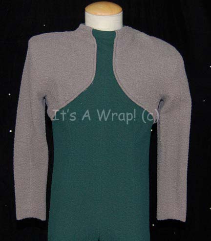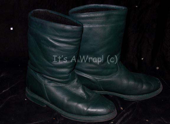 Description: A costume featured in various episodes of Star Trek: Deep Space Nine for wear by Max Grodenchik as the beloved Ferengi “Rom”. This costume is his Bajoran worker uniform; it is a form-fitting, full-length, dark-teal jumpsuit featuring a textured fabric with matching gray sleeves, and a zip down the back. Included is a Ferengi-style head wrap and a knee brace with Velcro fasteners in the same motif; College Comfort name brand thermal boots painted a matching dark-teal with a wooly interior lining and a sewn in tag that reads ‘Siberian Husky’. A sewn in Deep Space Nine tag reads ‘Max Grodenchik’ and every other item except the boots are labeled at least ‘Max’; a costumer’s tag reads ‘DS9, Rom, Max Grodenchik, Bajoran Worker’.