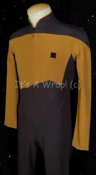 Description: A costume featured in various episodes of Star Trek: The Next Generation. This costume is a Starfleet uniform jumpsuit and features black shoulders with an Operations Gold chest, back, sleeves, and as piping around the Mandarin collar; black waist and legs that end in stirrups, a zip down the front, Velcro placement for a commbadge on the left breast (sold separately). A sewn in tag reads ‘40L, 257’.