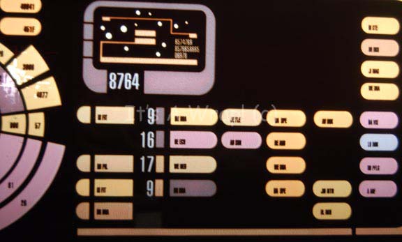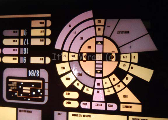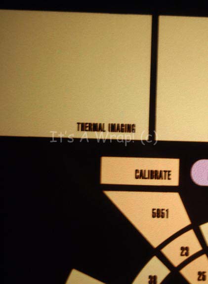 Description: An LCARS style (Library Computer Access and Retrieval System) control surface believed to have been part of “Captain Picard” (Patrick Stewart) and “Worf’s” (Michael Dorn) shuttlecraft helm during their pursuit of “Data” (Brent Spiner) in Star Trek IX: Insurrection. The item is a sheet of smoked acrylic cut in a trapezoid shape with rounded corners and a graphical application adhered to the reverse that is best viewed when back lit by an external light source. The graphic depicts a pitch and attitude control, a small star field screen, and several banks of indicator lights and faux buttons. The controls are inscribed ‘Metaphasic Scan’, ‘Shield Rotation’, and more while the faux buttons feature acronyms based around the names of several production crew. The item measures approx. 13.25 X 53 inches across the top and 41.5 across the bottom. The item depicts a degree of damage due to time and storage conditions in that the graphic features a bit of scuffing and a tear where a light box was removed prior to auction which retains dried adhesive.